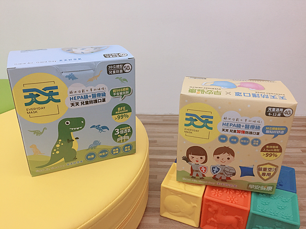 天天出的兒童口罩有兩款,一個是4-8歲「兒童防護口罩」另一個則是針對6-12歲小孩使用的「兒童加強防護口罩」。