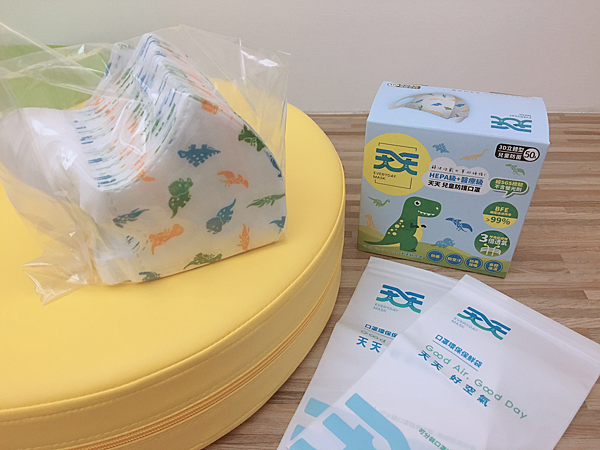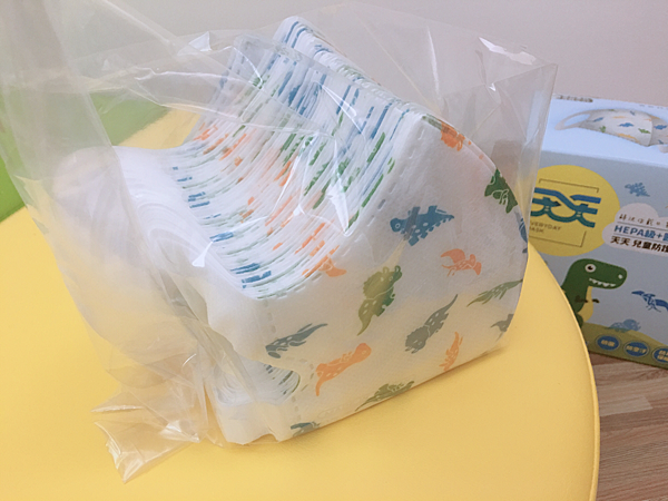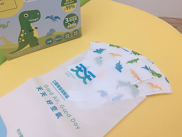 打開後的內容物有口罩還有口罩外出攜帶夾鏈袋,這個夾鏈袋整個就是超貼心的存在,之前奴媽每次上班要攜帶口罩時,還要去找透明塑膠袋分裝,天天的每款口罩都有提供專用夾鏈袋,省去還要另外找袋子的困擾啊。而口罩上小恐龍圖案簡單又可愛,兒童口罩如果不夠吸引小孩,小孩抗拒配戴的機會就比較大。