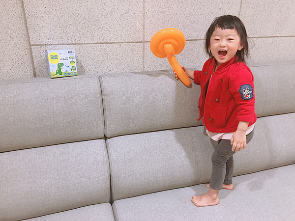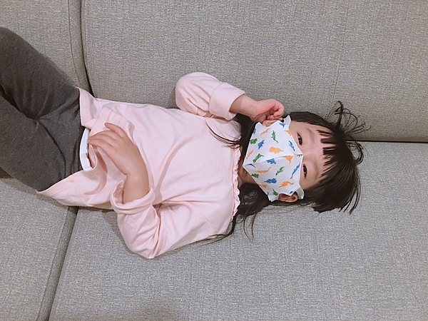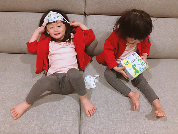 DoRe 實際看到口罩的時候,整個玩很開心~因為她們最近才一直看到恐龍,恐龍完全是小孩的菜!一陣亂玩搞笑~完全不會排斥,超棒的。
