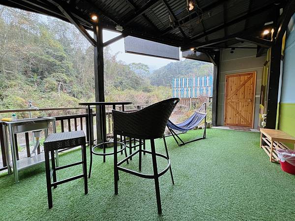 四周都是綠意盎然的自然山野。馬車外面有一個小陽台,室內空間比較小,我覺得比較適合情侶或是兩大一小有攜帶寵物的~