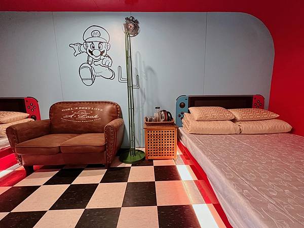 裡面有兩張雙人床,還有沙發跟瑪莉歐元素~