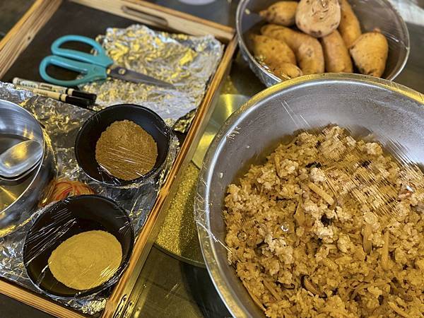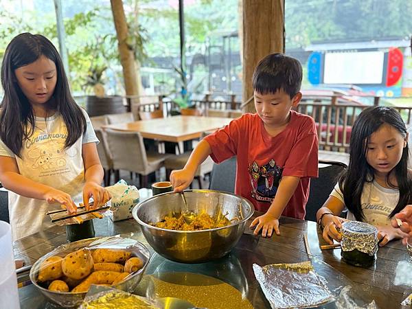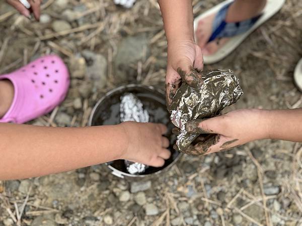 等待抓蝦的時間,還會來抹泥巴烤地瓜!完全不需要什麼感官盆,直接泥巴髒髒玩起來,小孩就是開心