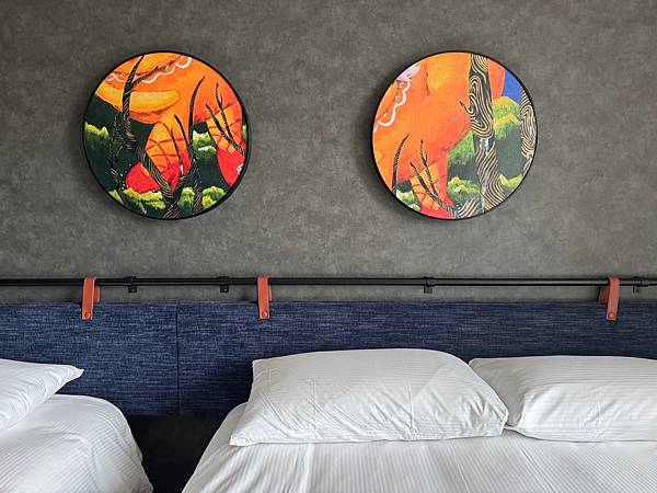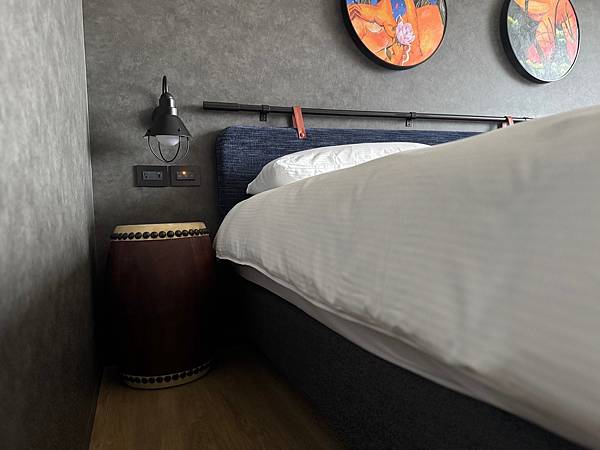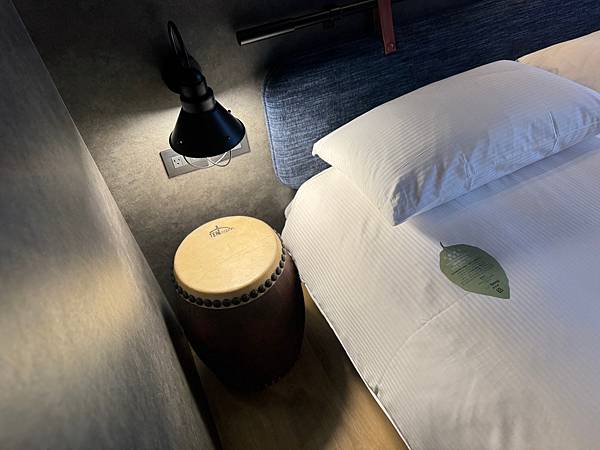 床旁邊的插座應有盡有,還用太鼓直接當放置物品的茶几,特色直接融入相當特別。