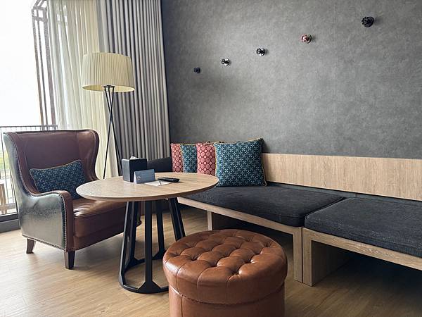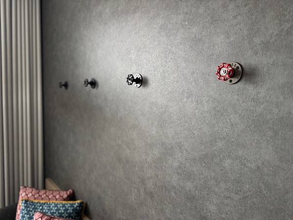拼花的抱枕、皮革沙發等既復古又不失流行~房間每一處真的都有細膩的品味存在。連可以掛置衣服的掛鉤,都有糖廠裡的工廠元素。