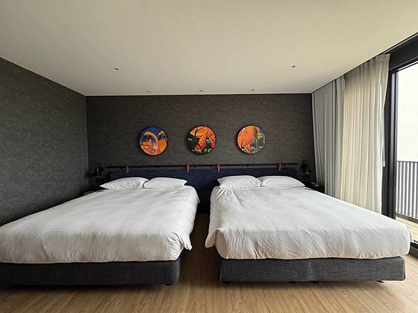 鼓迎家庭客房非常寬敞,房間是木地板,一旁還有整排的座位與單人沙發,採光很明亮~有整面的落地窗可以看戶外風景。