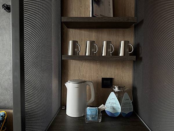 房間內有提供冷水壺可以裝水~水杯與茶包也都有。竟然還有奴媽很喜歡的經典「晶泡茶」在冰箱裡啦!