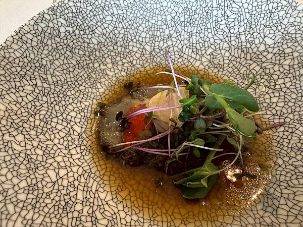 我們來的時候開胃菜是一道鮑魚佐鮭魚卵,微酸又鮮嫩的料理調味,吃起來脆口的爆擊,完全一開始就讓人好驚喜。