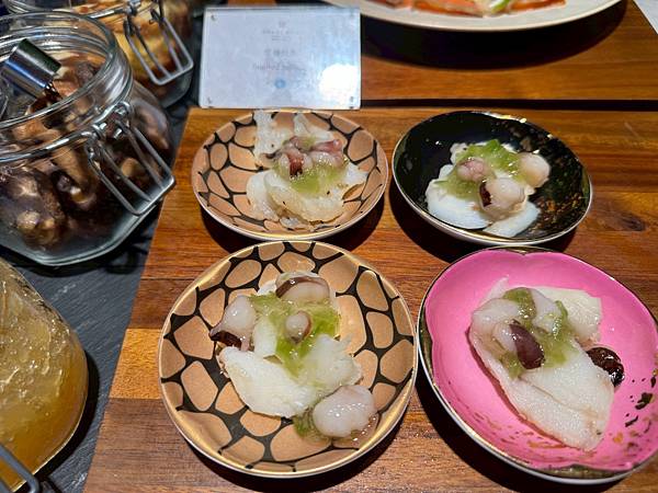 漬物跟小碟區!「四季餐廳」的餐點內容非常費工,一盤一盤方便取用的握壽司與醃製物等等,先來幾盤開胃超適合。